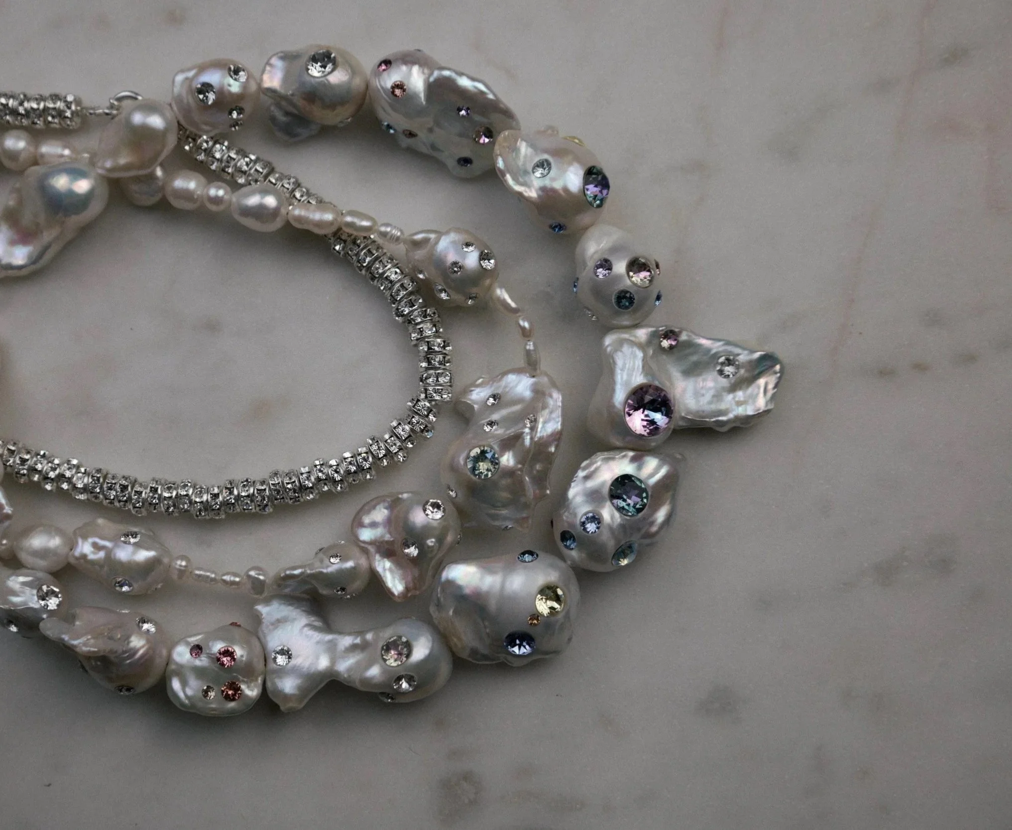 Natural pearls aren't always perfect - they can have small scratches or holes. Instead of discarding these pearls, we started to place sparkling crystal stones at exactly these spots. This way, we transform apparent flaws into radiant highlights.