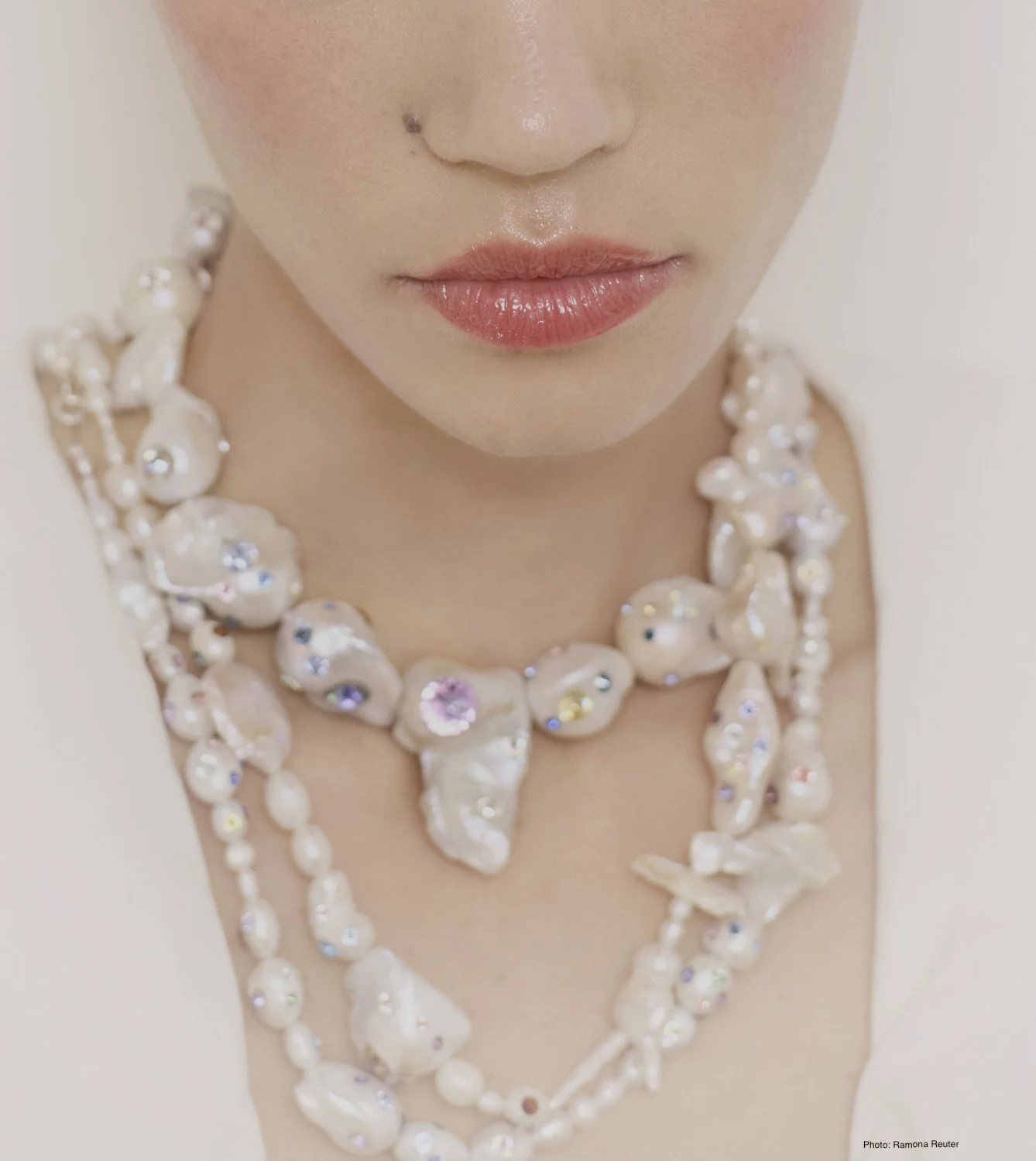 Natural pearls aren't always perfect - they can have small scratches or holes. Instead of discarding these pearls, we started to place sparkling crystal stones at exactly these spots. This way, we transform apparent flaws into radiant highlights.